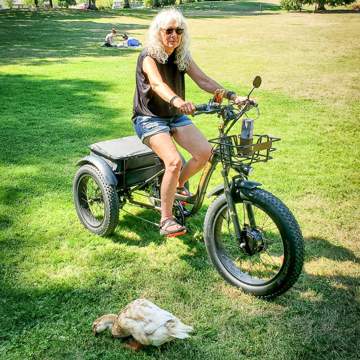 La bicicleta eléctrica de tres ruedas con neumáticos gruesos MF-30 tiene un diseño de chasis Step-Thru para que más ciclistas puedan subirse fácilmente a la bicicleta, independientemente de su altura o de la ropa que lleven puesta.