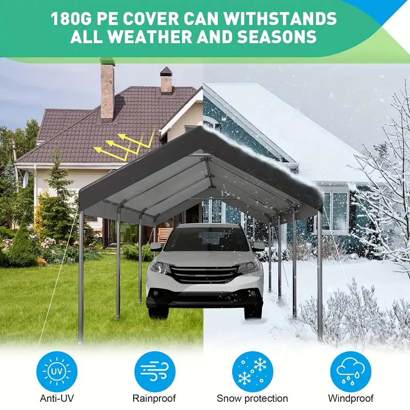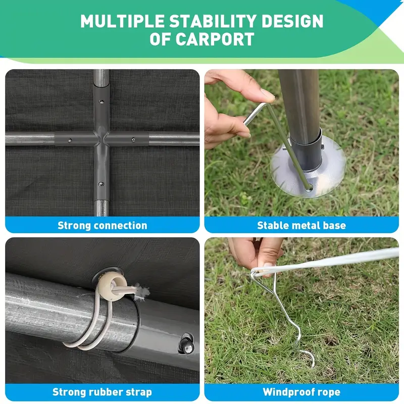 [CONSTRUCCIÓN RESISTENTE] Con un marco de acero con recubrimiento de polvo resistente al óxido y patas de acero galvanizado duraderas, esta cochera ofrece una estabilidad y resistencia incomparables. Las 8 patas reforzadas brindan una base sólida, lo que garantiza una protección duradera para su vehículo.