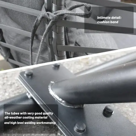 Material calificado: tubería laminada en frío con buena resistencia, el grosor de la tubería principal es de más de 3,0 mm ~ 10 mm; Envoltura de ratán de resina de polietileno con protección UV, con resistencia y durabilidad, resistencia a la intemperie, resistencia a la corrosión, inodoro y fácil de limpiar Características; Cojín de 10" de espesor, espuma de alta densidad, suave y confortable; tejido de olefina de alta calidad de 230g/m2;