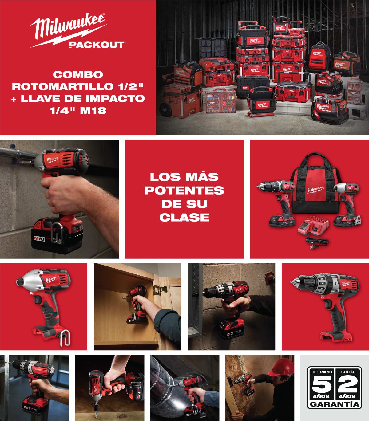 El juego combinado de 2 herramientas inalámbricas de milwaukee incluye 1 taladro, 1 destornillador y 4 accesorios que te permitirán realizar trabajos de mejor calidad. Cuentan con 2 distintas velocidades. El taladro percutor/destornillador compacto de 1/2 pulgada y el destornillador de impacto hexagonal de 1/4 de pulgada cuenta con sistema inalámbrico m18 y un diseño innovador que les da 40% mayor tiempo de funcionamiento al recargar su batería con el cargador. Su motor sin marco ofrece un mejor desempeño en un tamaño compacto y el sistema de manejo de temperaturas ofrece una protección contra las sobrecargas para maximizar la potencia y durabilidad evitando el sobrecalentamiento de la máquina.