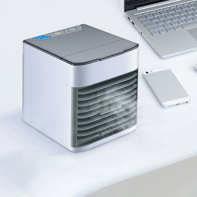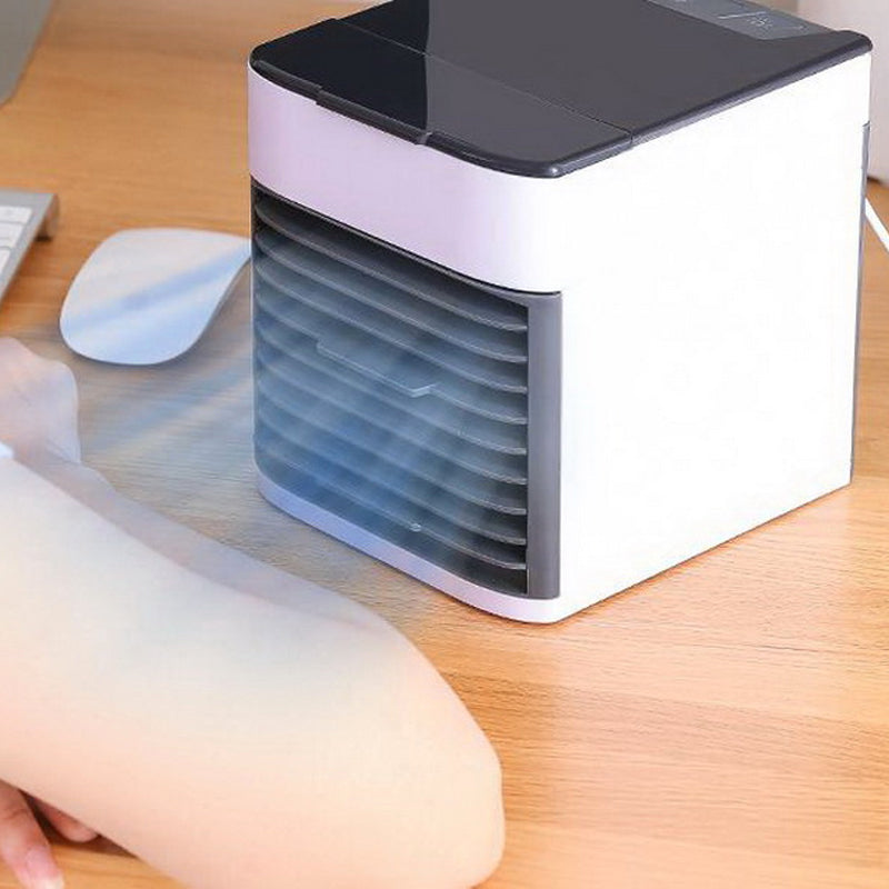 Enfriador de aire acondicionado ideal para escritorio, tiene conexión USB y puedes llenarlo con agua fría para mejorar tu experiencia y generar un aire mucho más frío y refrescante. También puedes agregar tus esencias favoritas al agua para que llene tus espacios con aroma y purifique tu aire. Tiene distintas intensidades y puedes cambiar la dirección del aire como tu quieres.