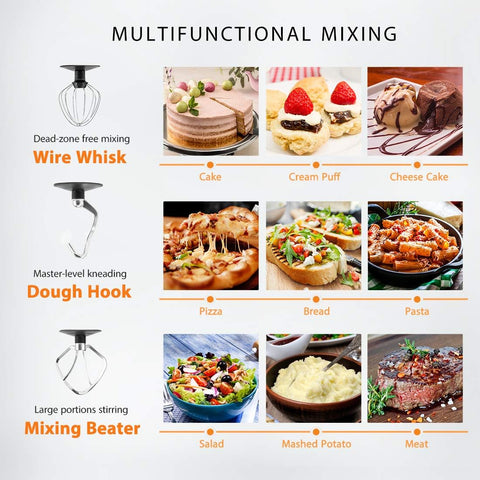 El juego de accesorios incluye tres herramientas esenciales: un gancho para masa de aluminio resistente, un batidor de alambre de acero inoxidable y un batidor para mezclar de aluminio.