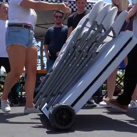 Despliega la mesa, expande las patas y simplemente retrae las ruedas hacia arriba y fuera del camino hasta que sea el momento de plegarlo todo y listo. Cuando sea el momento de ir, simplemente despliega las ruedas, carga los estantes con tu equipo y ¡deslízate!